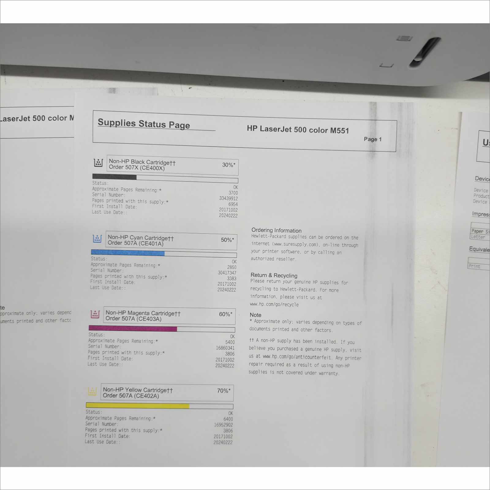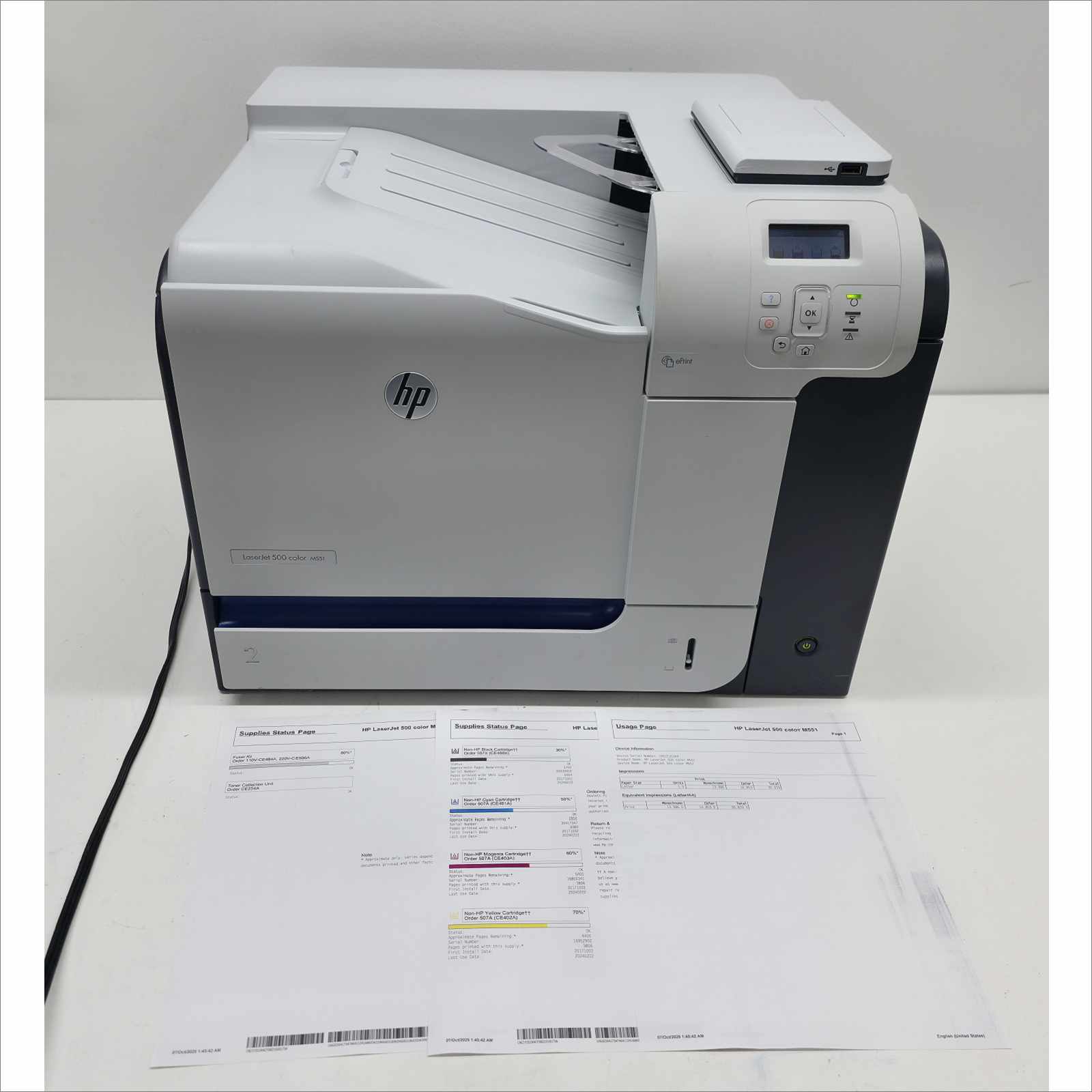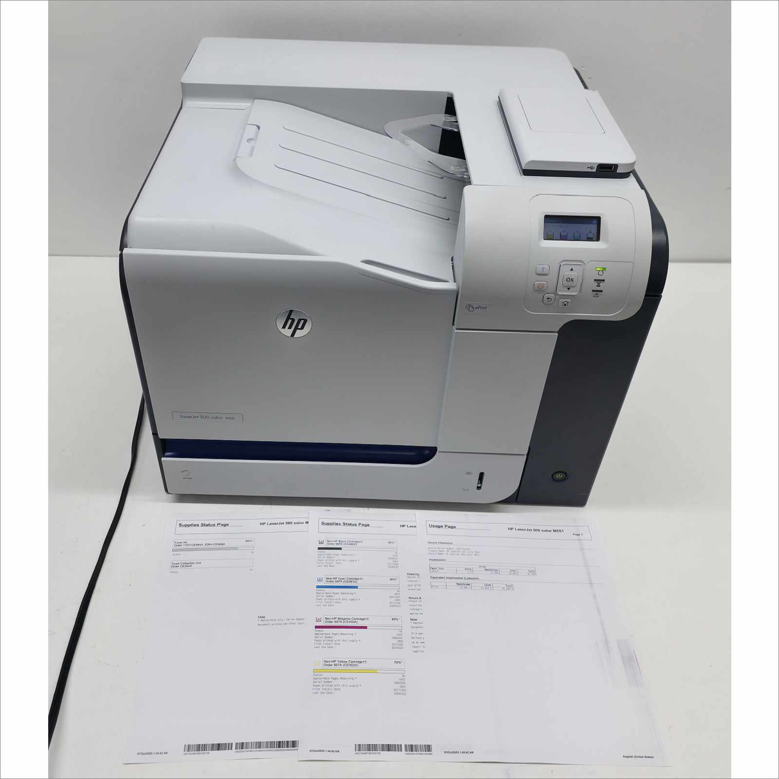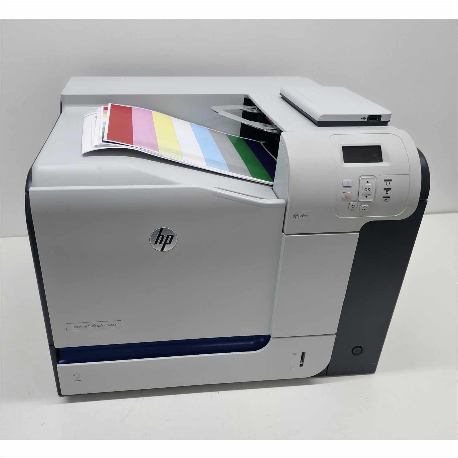 This HP LaserJet 500 Color M551 Printer (PN# CF082A) is guaranteed to be in working condition with normal cosmetic wear. The printer produces a vertical line when printing color pages, as pictured, which indicates it may need internal cleaning or maintenance.