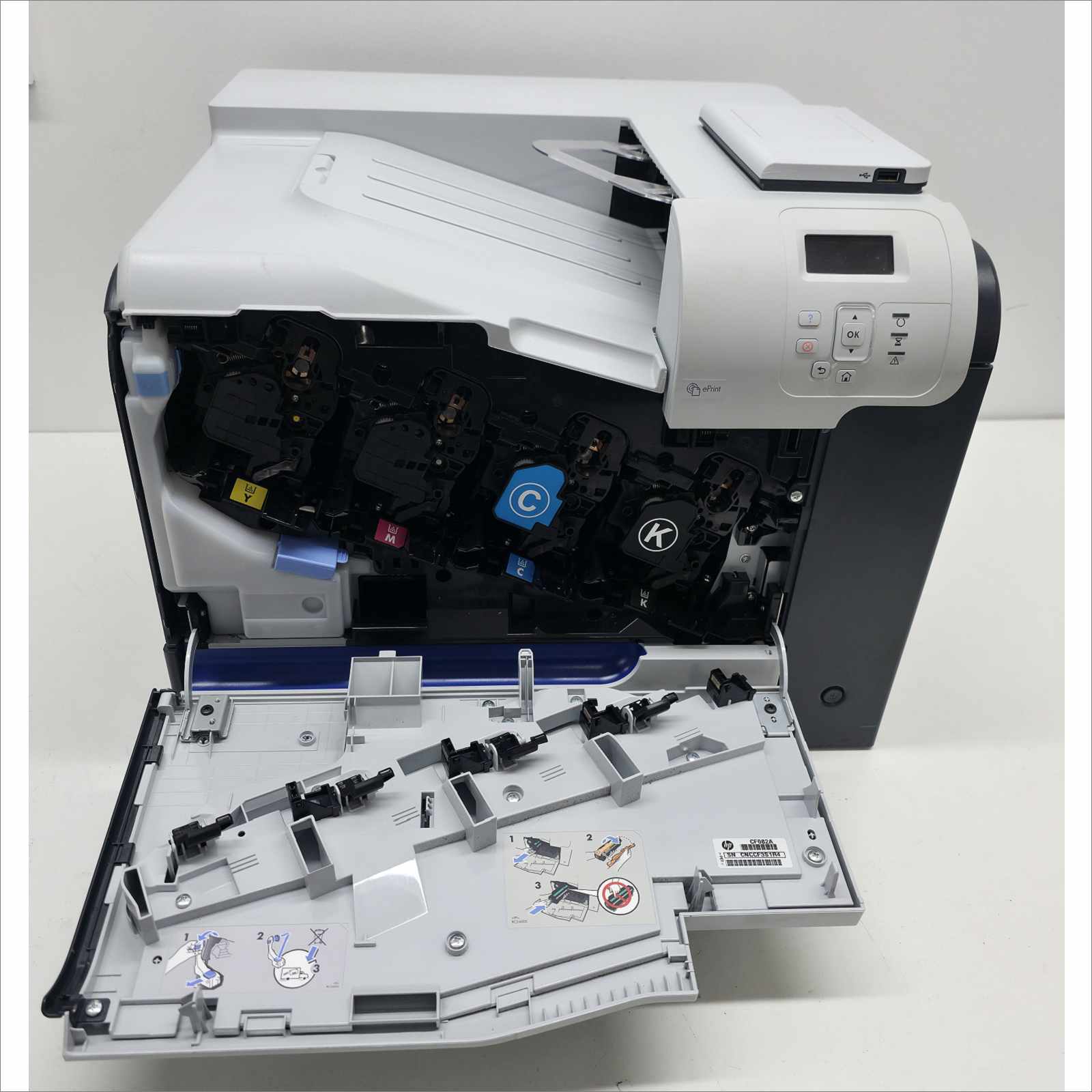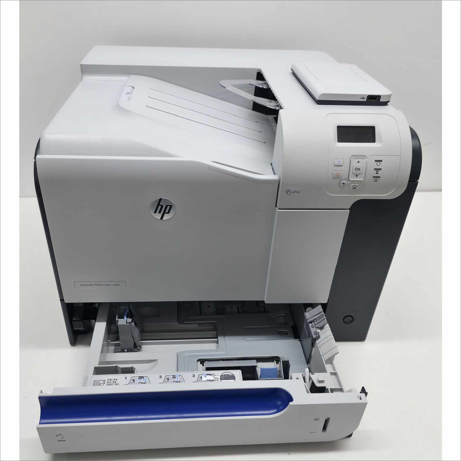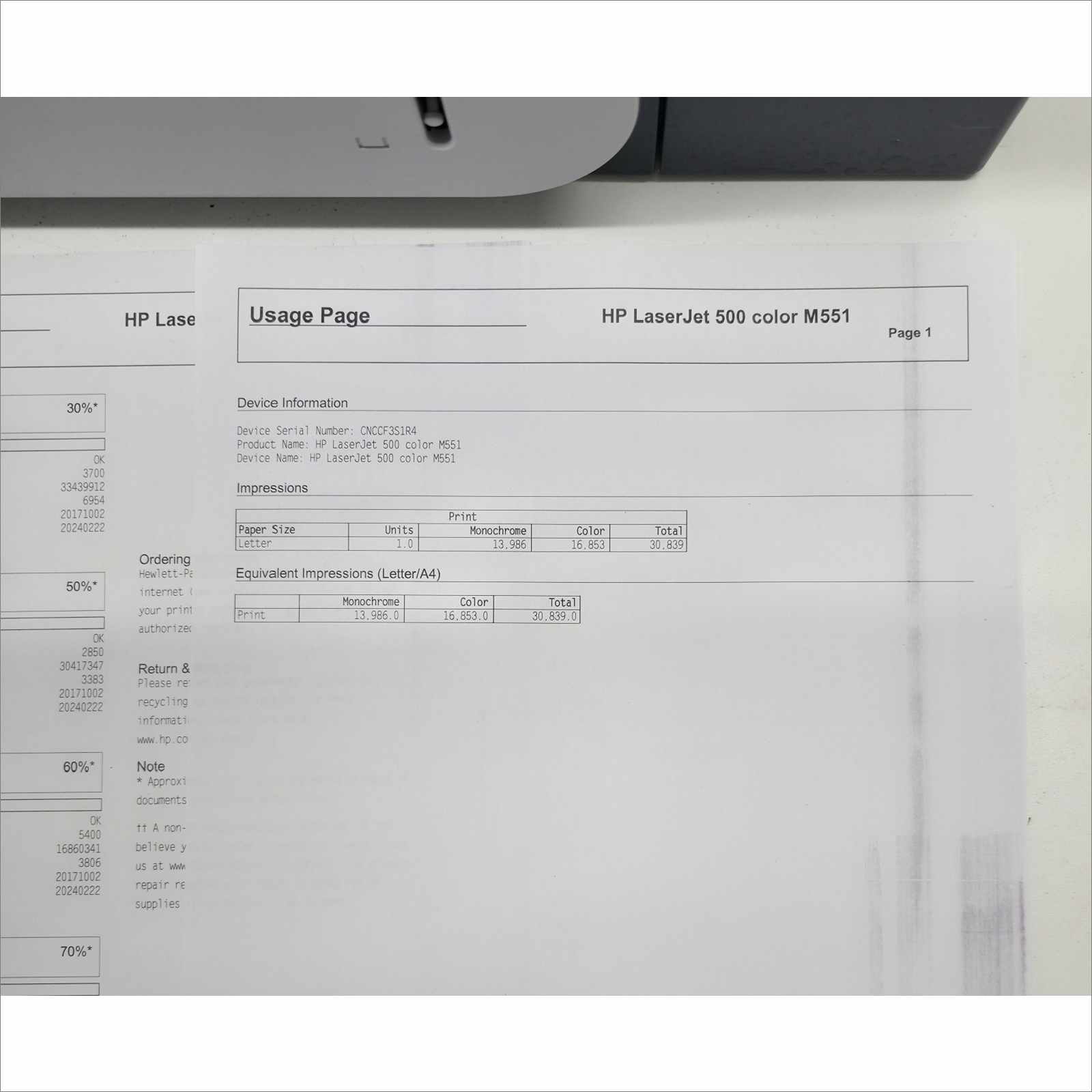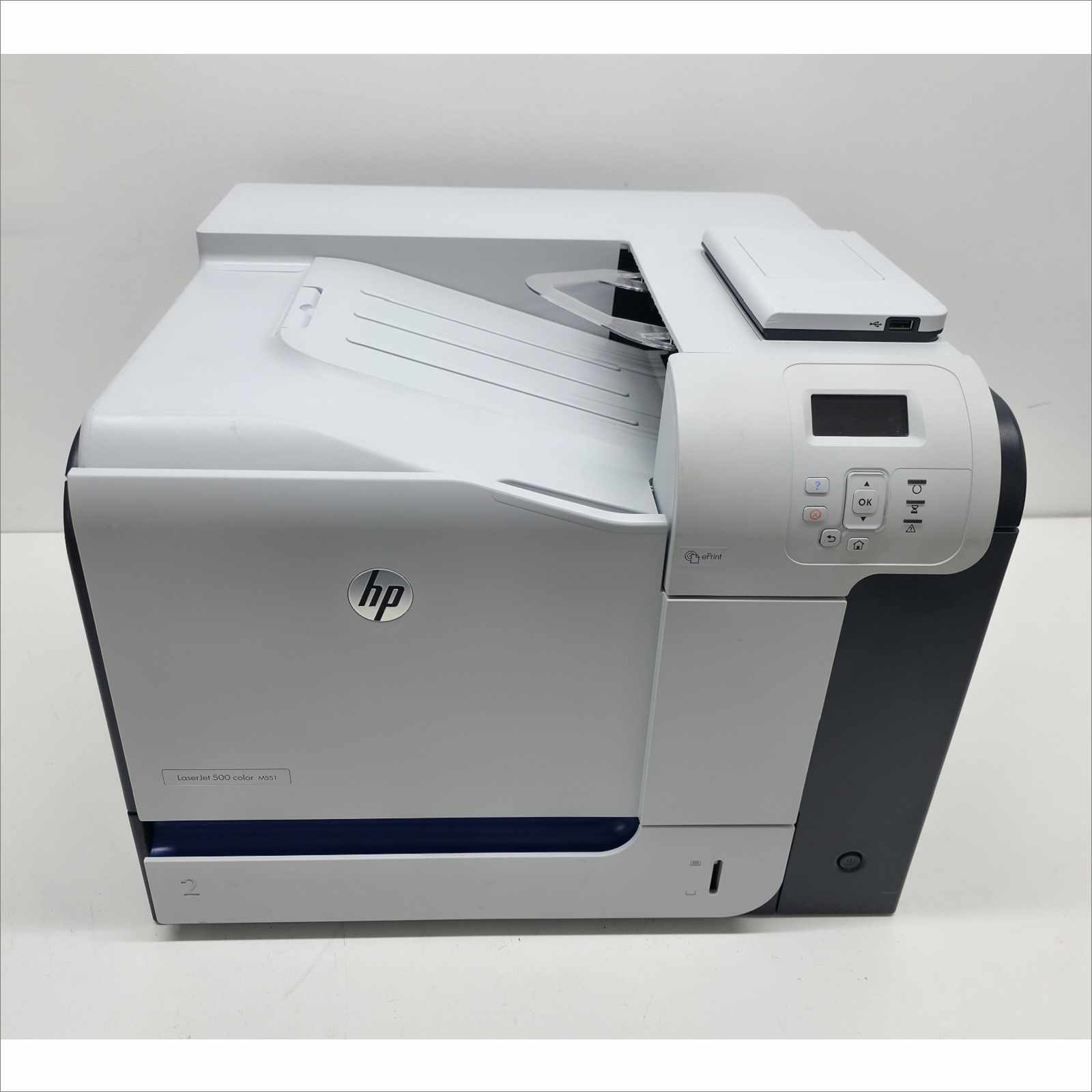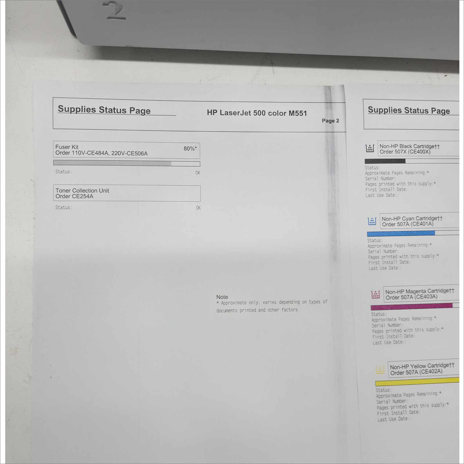 This HP LaserJet 500 Color M551 Printer (PN# CF082A) is guaranteed to be in working condition with normal cosmetic wear. The printer produces a vertical line when printing color pages, as pictured, which indicates it may need internal cleaning or maintenance.