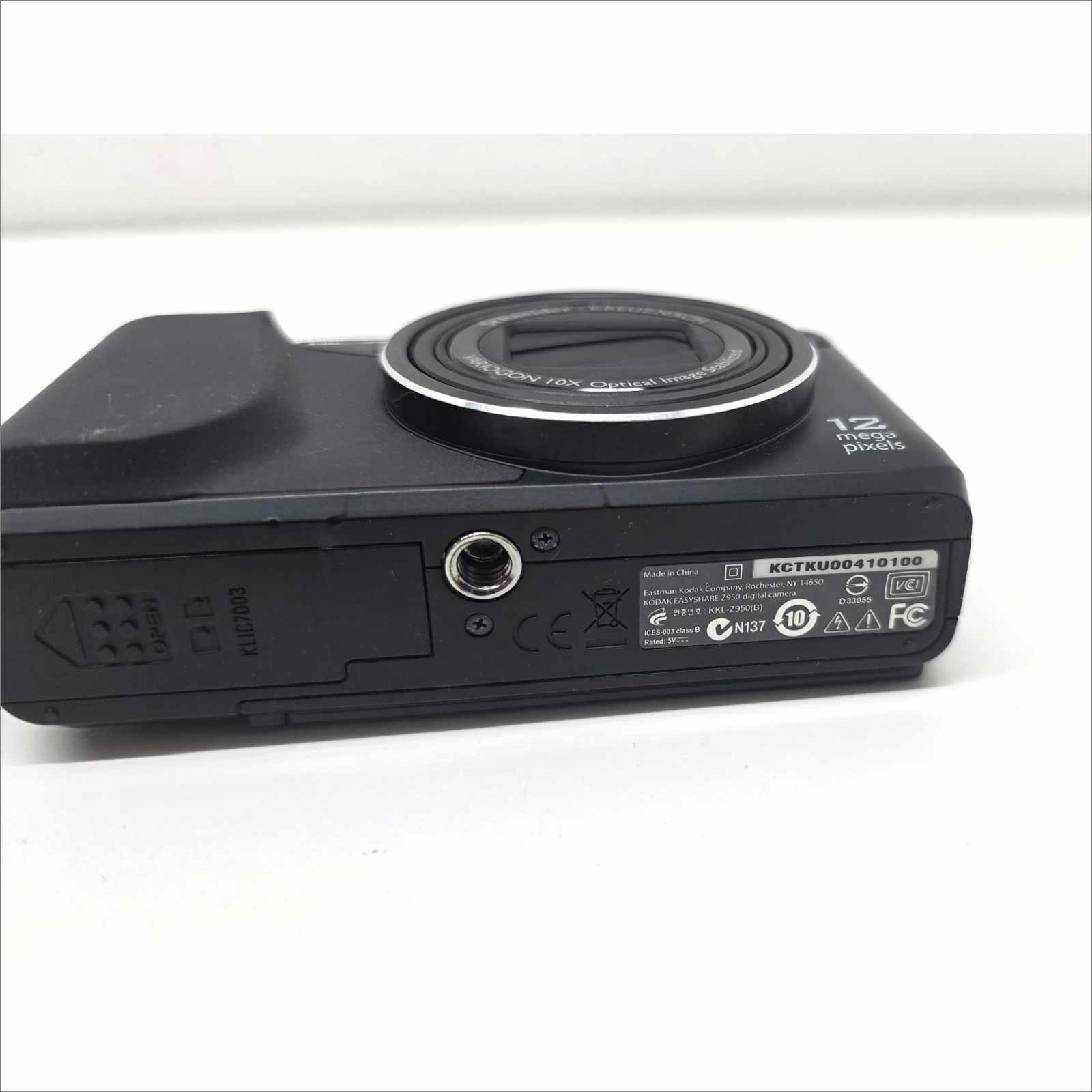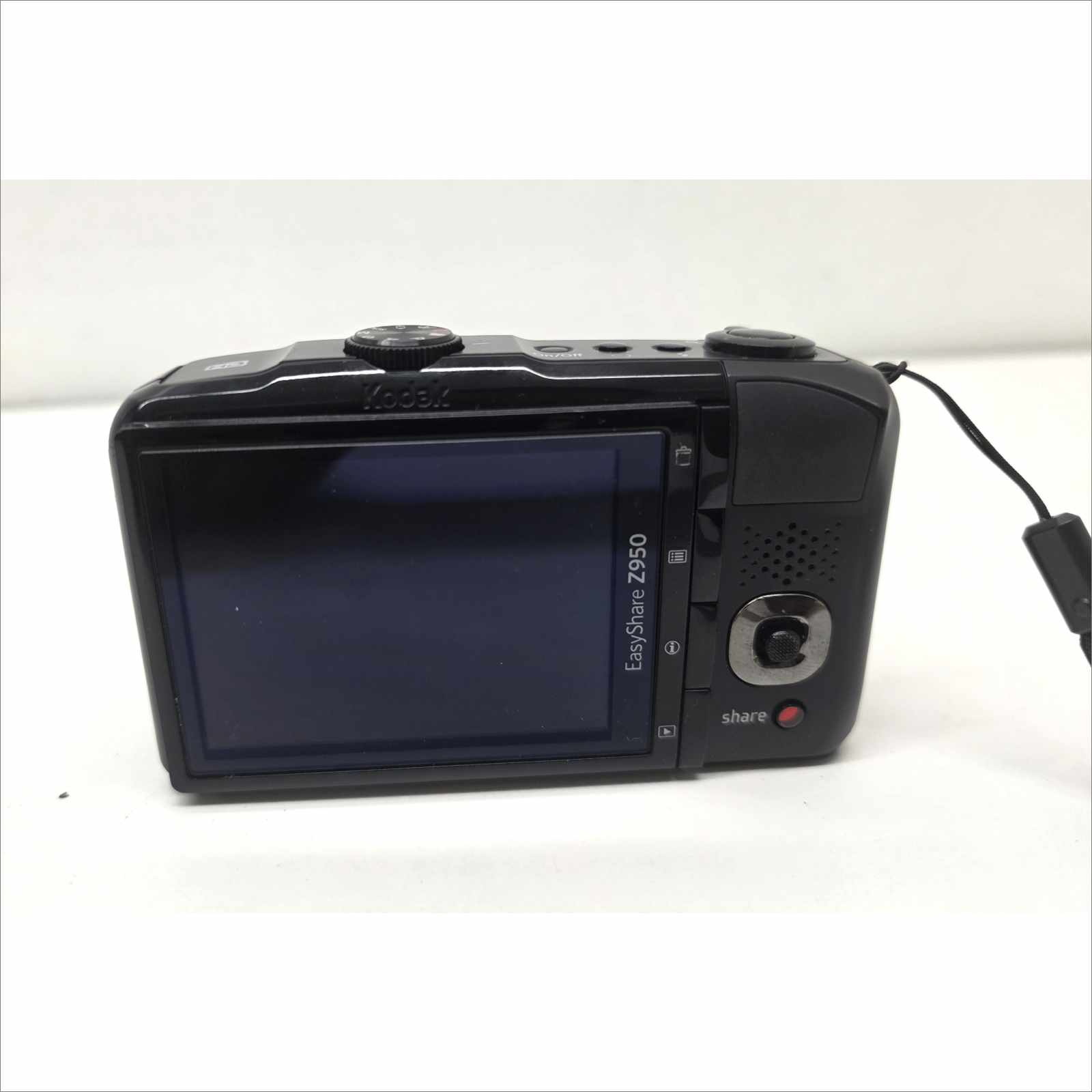 This Kodak EasyShare Z950 features a 12MP 1/2.3-inch CCD sensor, a 10x Schneider-Kreuznach optical zoom lens (35-350mm equivalent), and a 3-inch 230K-dot LCD screen. It offers optical image stabilization, 720p HD video recording, and a Li-ion rechargeable battery, with storage via SD/SDHC cards.