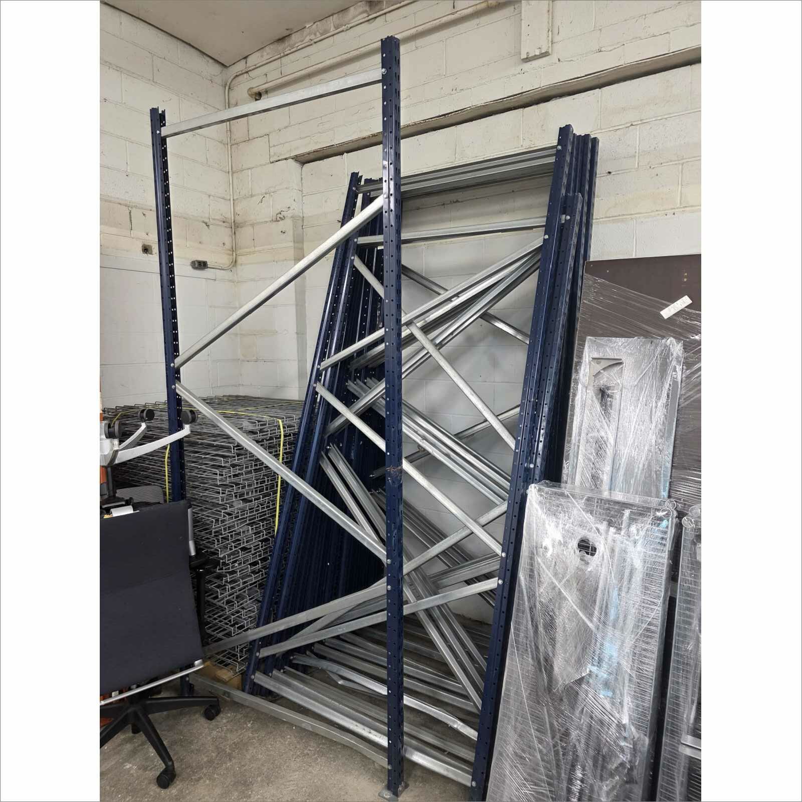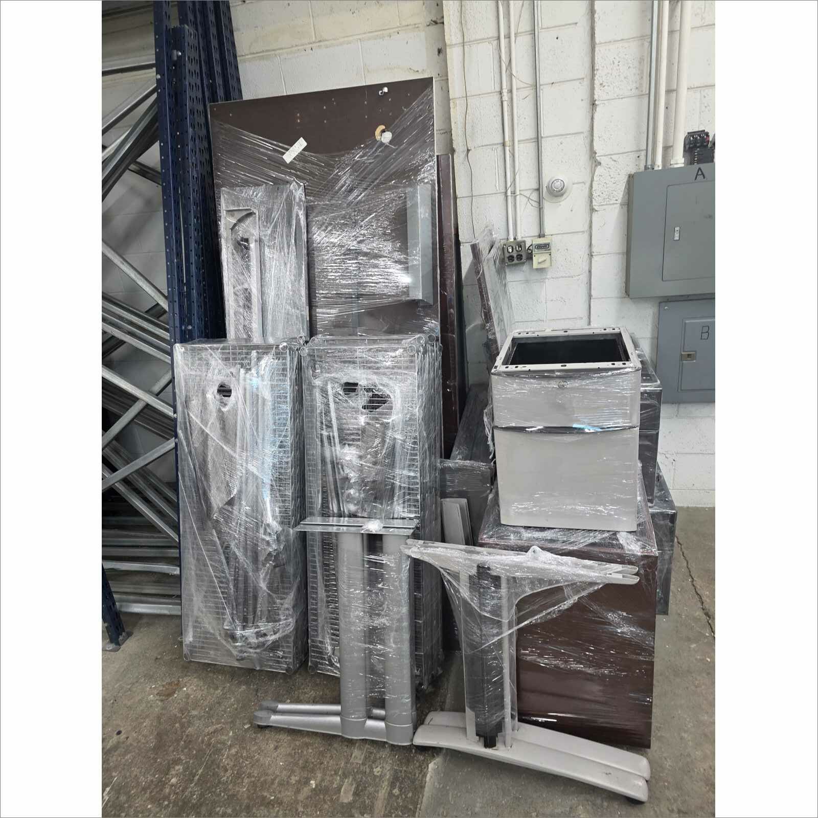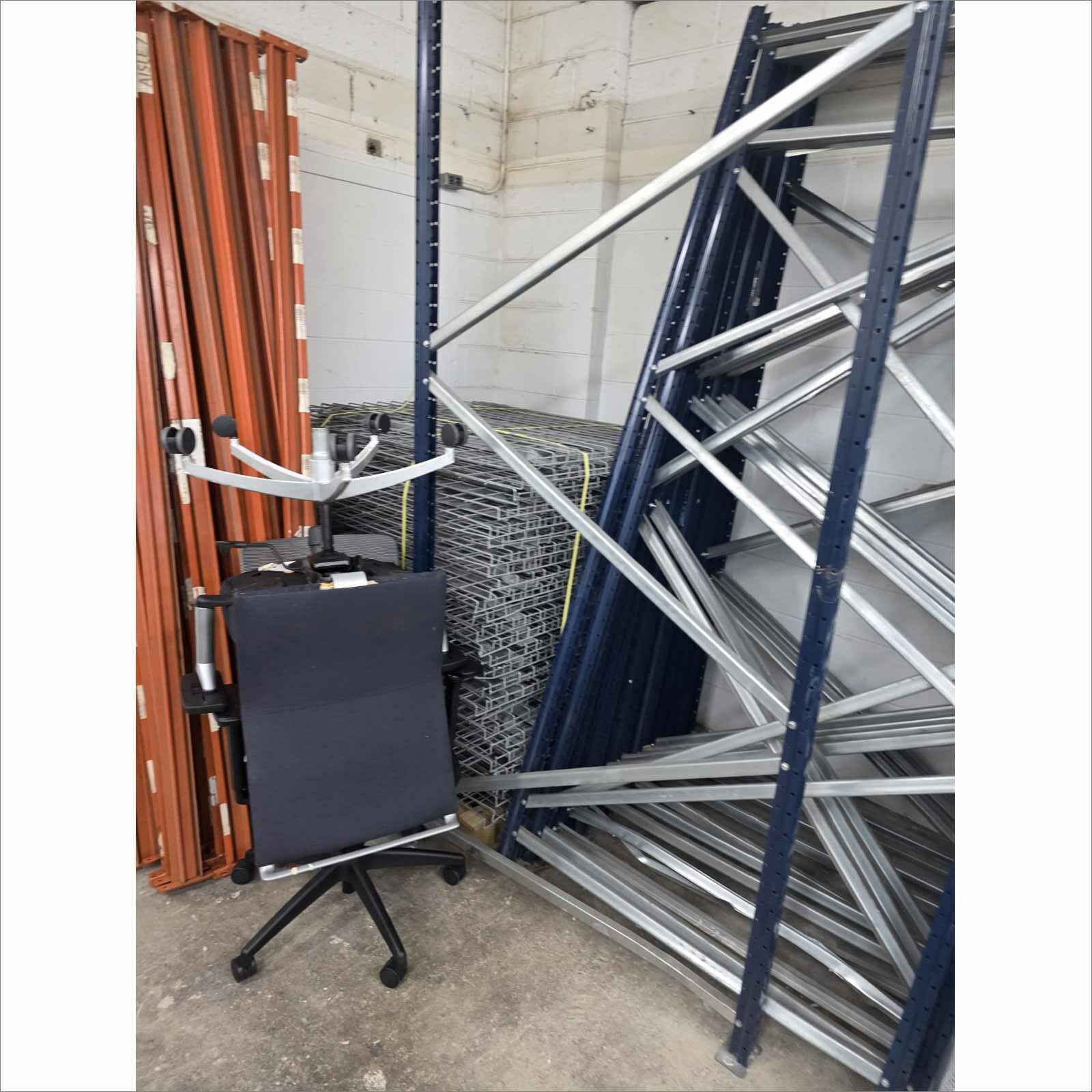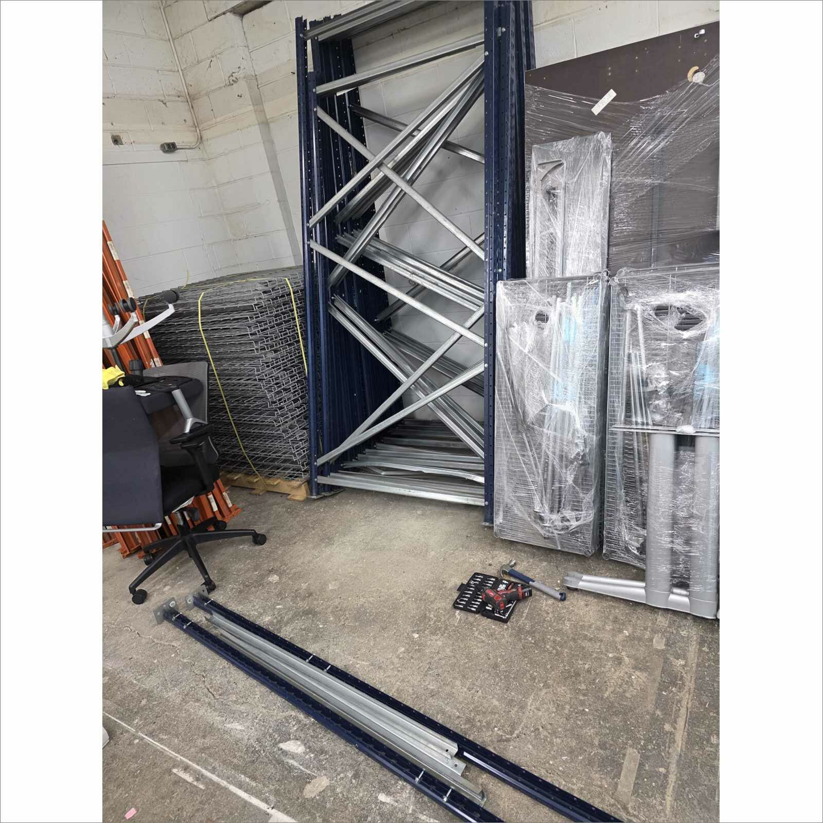 This auction includes a complete set of professional-grade office and warehouse furniture, consisting of 13 major items ranging from executive desks and conference seating to heavy-duty industrial shelving and packing tables.